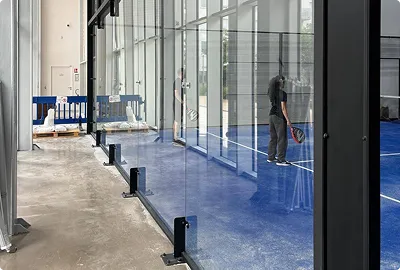 Design moderne sans poteaux en fond de court, offrant une vue panoramique totale pour les joueurs et les spectateurs.